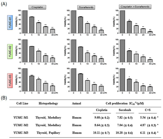 Combinational anticancer effects of cisplatin and sorafenib in patient-derived MTC YUMC-M1, M2, and M3 cells compared to the effects of each agent alone. (A) Cell viability with cisplatin and sorafenib combined or each agent alone. All experiments were repeated at least thrice. Data represent mean ± standard deviation. * p < 0.05 and ** p < 0.01 versus control. (B) IC50 values for the combination of cisplatin and sorafenib in patient-derived MTC, YUMC-M1, M2, and M3 cells. Each data point signifies the mean of three independent MTT assays, performed in triplicate. SEM, standard error of the mean; MTT, 3-(4,5-dimethylthiazol-2-yl)-2,5-diphenyltetrazolium bromide; IC50, half-maximal inhibitory concentration. The asterisk indicates lowest half-maximal inhibitory concentration.
