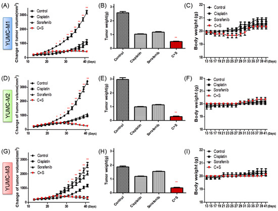Anticancer effects of cisplatin and sorafenib in combination or with each agent alone in patient-derived MTC cell lines, YUMC-M1, M2, and M3 cell xenografts in vivo. (A,D,G) Change in tumor volume. (B,E,H) The dissected tumor weight. (C,F,I) Change in whole body weight. Cisplatin and sorafenib had no significant effect on mouse body weight. * p < 0.05 and ** p < 0.01, compared with control.