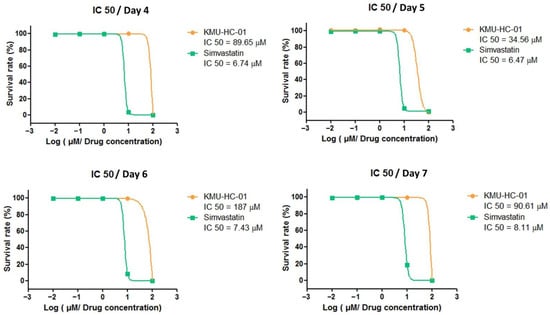 The cytotoxic effects of KMUHC-01 were measured using the CCK-8 assay. The IC50 values of the D1 cells that were treated with KMUHC-01 and simvastatin for 4 days are 89.65 and 6.74 μM, respectively, and for 7 days, 90.61 and 8.11 μM, respectively (Figure 2).