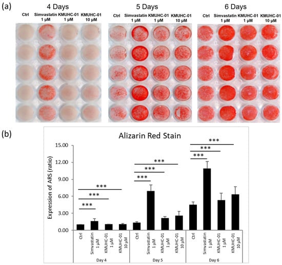 Alizarin Red S staining was used to determine the extracellular matrix calcification level induced by KMUHC-01 in D1 cells after treatment for 1 week. In brief, D1 cells (8 × 104 cells/well) were seeded in a 48-well plate. The cultures were divided into four groups as follows: control, 1 μM of simvastatin, 1 μM of KMUHC-01, and 10 μM of KMUHC-01 groups. These cells were fixed with 4% paraformaldehyde at room temperature of 25 °C for 5 min after 1 week. After washing once with double-distilled H2O (ddH2O), 300 μL of Alizarin Red S solution (2% ddH2O, at pH = 4.2) was added to each well in the 48-well plate. The staining solution was removed 5 min later, and each well was washed with H2O four times. The fixed and stained plates were then air-dried at 25 °C. The amount of mineralization was determined by dissolving the cell-bound Alizarin Red S in 10% acetic acid and spectrophotometrically quantified at 415 nm.