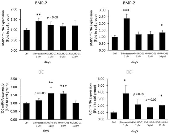 The quantitative results from Alizarin Red staining showed that the simvastatin 1 μM, KMUHC-01 1-μM and 10-μM groups had significantly enhanced D1 cell mineralization compared with the control group. Further, the effect on the induction of mineralization in the simvastatin 1 μM group was better than that in the KMUHC-01 1 μM and 10 μM groups (Figure 3a,b). We measured the mRNA levels of osteogenic genes (BMP-2 and OC) in the D1 cells treated with simvastatin and KMUHC-01 (Figure 4) and found that the simvastatin 1 μM and KMUHC-01 10 μM groups showed more BMP2 gene expression than the control group, with significance, on day 5. Other groups of KMUHC-01 showed increased BMP-2 expression without statistical significance. The KMUHC-01 1 and 5 μM groups showed a significantly increased OC expression compared with the control group on day 1. The simvastatin 1 μM and KMUHC-01 10 μM groups showed significantly increased OC expression by day 5.