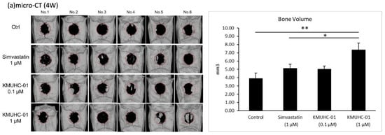 The critical-sized calvarial defects (6 mm in width and approximately 0.7 mm in depth) were prepared with reference to our previous study []. The development of bone defects was under anesthesia via intraperitoneal injection of ketamine (Parke–Davis, Detroit, MI, USA; 10 mg/100 g body weight) and xylazine hydrochloride (Bayer HealthCare, Leverkusen, Germany; 12 mg/100 g body weight). The hair over the calvarium was shaved by using a depilator. A midline incision over calvarium was made and a 6 mm diameter hole was drilled to penetrate through the calvarial bone by using a trephine bur carefully with simultaneous irrigation of PBS to avoid thermal damage and damaging the dura mater. At the end of the operation, the surgical wounds were closed with 5-0 Nylon sutures. The medications (PBS, simvastatin, or KMUHC-01) were injected 3 days postoperatively into the bone defects daily for 7 days according to the grouping. All experimental rats survived and showed no wound complications throughout the experiment.