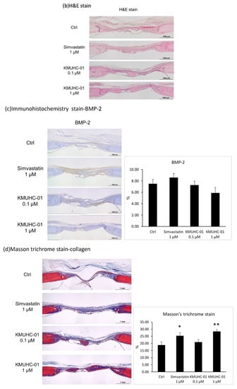 Rat calvarial bone defect treated with local simvastatin and KMUHC-01 injections. (a) The radiography study with micro-CT and the data of bone volume within the bone defect at 4 weeks postoperatively; (b) the representative sections of the histological study with hematoxylin and eosin (H&E) staining; (c) immunohistochemistry staining for BMP-2; and (d) Masson’s trichrome staining. (* p < 0.05; ** p < 0.01, comparison with control group).