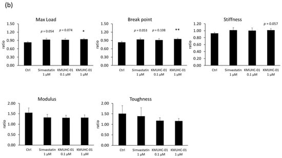 Rat femur bone defect treated with local simvastatin and KMUHC-01 injections. (a) A representative rat femur bone defect model is shown in the experimental photograph and the image of micro-CT postoperatively; (b) the biomechanics study of three-point bending tests to analyze the mechanical properties at the end of femur bone defect model (6 weeks postoperatively), which are expressed using the defect-to-nondefect femur ratio. (* p < 0.05; ** p < 0.01, comparison with control group).