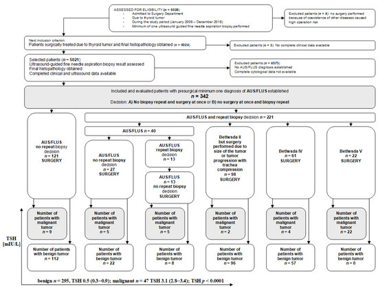 From the initial group of patients (n = 5028), we extracted data for 342 (6.8%) patients with an AUS/FLUS diagnosis (category III according to the 2nd edition of TBSRTC). We excluded from the study patients who were under nonsuppressive thyroid hormone therapy, patients with a history of head and neck radiation exposure, individuals in a hyper- or hypothyroidism status, and patients with a history of family TC and previous radioactive iodine treatment or thyroid surgery.