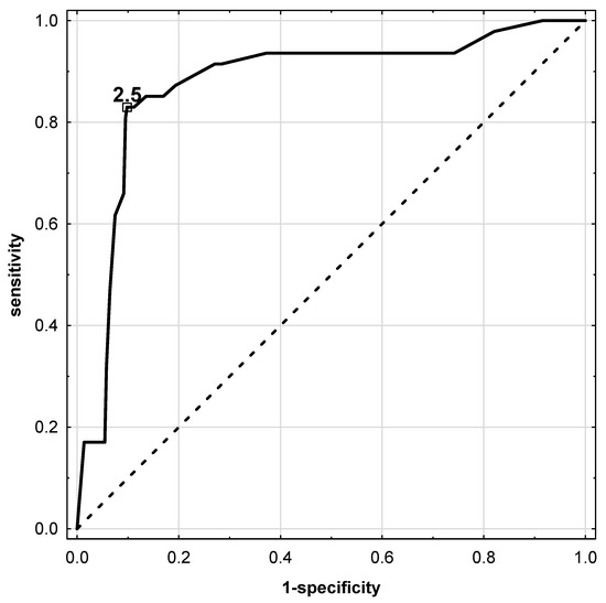 The number of female patients with thyroid malignancy was significantly higher than that of male patients (p = 0.003). Regarding nodules, TC was more often diagnosed in younger patients, i.e., below 55 years old (p < 0.05). We observed a significantly higher frequency of the occurrence of ultrasound features such as microcalcifications, hypoechogenicity, high vascularity, presence of irregular margins, and taller-than-wide tumors in patients with cancer (p < 0.0001 for all). The median TSH concentration was significantly higher in the cancer group than in the benign thyroid tumor group (p < 0.0001). Therefore, the diagnostic potential of serum TSH level was determined to evaluate the risk of malignancy in patients with thyroid nodules classified as the Bethesda III category. ROC analysis showed that TSH concentration at a cutoff point of 2.5 mIU/L may be an acceptable prognostic factor for thyroid cancer (Figure 2).