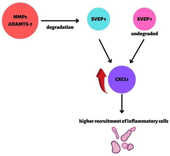 The role of SVEP1 in atherosclerosis and CAD []. CXCL1 expression is dependent on the presence of SVEP1. Only in the presence of SVEP1 is the CXCL1 expression silenced. Two factors have a significant influence on the expression of CXCL1: MMPs and ADAMTS- 7 (specific metalloproteinases), which can reduce the wildtype SVEP1; mutant SVEP1 (SVEP1_p.D2702G missense variant). Consequently, the secretion and recruitment of inflammatory cells are increased.