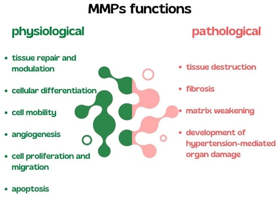 The remodeling of the vascular extracellular matrix (ECM) during hypertensive impairment has been associated with the involvement of matrix metalloproteinases (MMPs) and their tissue inhibitors (TIMPs). Several MMPs and TIMPs might participate in the vascular remodeling associated with the AH. Matrix metalloproteinases (MMPs) are a family of zinc-dependent endopeptidases, involved in many physiological and pathological processes, particularly tissue repair and modulation, cellular differentiation, cell mobility, angiogenesis, and cell proliferation, migration, and apoptosis. The dysfunction of MMP activity leads to a progression of various pathologies, tissue destruction, fibrosis, and matrix weakening []. It is worth mentioning that MMPs are also involved in the development of hypertension-mediated damage to the vascularity, heart, and kidneys, leading to organ failure and cardiovascular complications (Figure 3) []. Endogenous tissue inhibitors of MMPs (TIMPs) are crucial in restraining the degradation of ECM. Furthermore, the pathological processes in the vessel wall might be provoked by an excessive amount of MMPs, due to an imbalance between MMPs and TIMPs [].