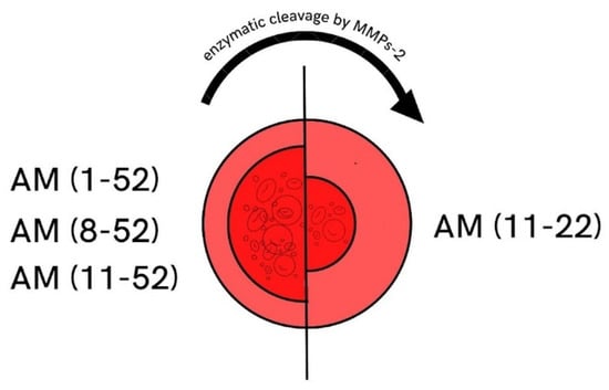 Martínez et al. found that, in rats, MMP-2 may regulate BP by destroying the vasodilator peptides adrenomedullin (AM) 1–52, 8–52, and 11–52 (Figure 4). AM plays a role in the regulation of BP. MMP-2 cleaves the vasodilator peptide AM (1–52, 8–52, and 11–52) into smaller peptides AM (11–22), which act as the vasoconstrictors. MMP-2 activity may be related to the development of AH, both by reducing the levels of the potent vasodilator AM (1–52, 8–52, and 11–52) and by generating hypertensive molecules [].
