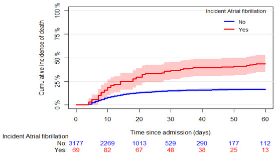 According to the Cox multivariable regression, the significant determinants of incident AF were age (HR: 1.041; 95% CI: 1.022, 1.060), a history of non-permanent AF (HR: 2.720; 95% CI: 1.508, 4.907), and ICU admission (HR: 5.311; 95% CI: 3.397, 8.302), while lymphocyte count (HR: 0.584; 95% CI: 0.384, 0.888) and eGFR (HR: 0.988; 95% CI: 0.980, 0.996) were inversely associated with AF occurrence (Table 2). The results were confirmed when admission therapies (beta-blockers, antiarrhythmics and anticoagulants) were added to the model (Supplementary Materials Table S1).