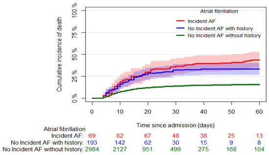 Six hundred eleven (17.8%) in-hospital deaths were recorded; 557 out of 3290 (16.9%) were in patients without incident AF, and 54 out of 145 (37.2%) were in patients with incident AF (p < 0.001). Figure 1 shows the cumulative incidence of mortality in patients who developed and did not develop AF (60-day mortality: 43.6% [95% CI: 34.5, 52.7] and 16.6% [95% CI: 15.3, 17.9], respectively, p < 0.001). Stratifying the latter group of patients according to AF history, we found higher mortality in patients with AF history than those without (Figure 2, 60-day mortality: 33.2% [95% CI: 26.4, 40.1] and 15.5% [95% CI: 14.2, 16.9], respectively, p < 0.001).