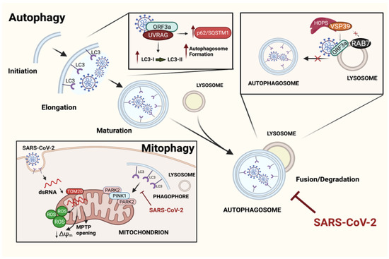Mechanisms of the SARS-CoV-2 evasion of autophagic pathways. Illustration depicting principal mechanisms developed by SARS-CoV-2 in order to use autophagy pathways for its own benefits. Diagonally, the main steps of the autophagic process are represented. The viral ORF3a interacts with UVRAG at high affinity, undermining the link UVRAG-BECN1 and promoting an accumulation of autophagosomes, which never fuse with lysosomes. Another mechanism through which ORF3a inhibits the autophagosome–lysosome fusion is by binding VPS39 of the HOPS complex, thus preventing the RAB7–VSP39 interaction. Even mitophagy has been reported to be affected by SARS-CoV-2. Indeed, once inside the cell, the viral dsRNA enters the mitochondria, thus leading to mitochondrial dysfunctions that promote PINK1/PARK2-dependent mitophagy. However, the process never ends as the virus blocks the incorporation of the mitochondria into autophagosomes, improving viral replication. Created with BioRender.com.