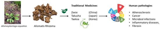 The dried rhizomes of the plants Alisma orientale Juzepczu and Alisma plantago-aquatica (Alismataceae), commonly referred to as Alismatis rhizoma, have long been used in folk medicine to treat a variety of diseases, including hyperlipidemia, diabetes, bacterial infection, edema, oliguria, diarrhea, dizziness, and certain inflammatory diseases. The phytomedicine is known as Takusha in Japanese, and Taeksa in Korean and Zexie in Chinese (Figure 1). In China, Alismatis rhizoma (Zexie) can be further separated into “Chuan Zexie” (Sichuan and Hubei provinces), “Jian Zexie” (Fujian and Jiangxi provinces), and “Guang Zexie” (Guangxi province) according to the producing areas [1].