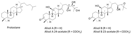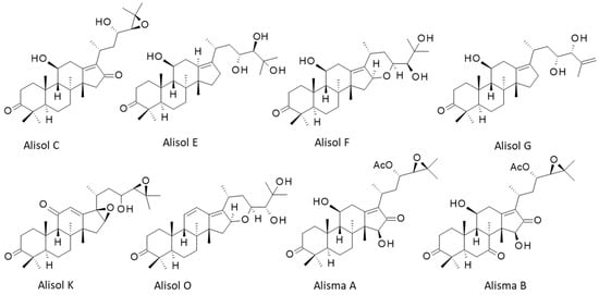 Alismatis rhizoma is known to contain a large diversity of bioactive components, mainly terpenoids endowed with anti-inflammatory, antioxidant, and antimicrobial activities. A recent phytochemical survey has identified over 220 bioactive molecules, including di-, tri-, and sesqui-terpenoids, alkaloids, phenylpropanoids, flavonoids, steroids, and polysaccharides [2]. The main subgroup of triterpenes found in Alismatis rhizoma are the alisols, a family of 22 compounds designated alisol A to alisol V [3,4]. These compounds are tetracyclic protostane-type triterpenoids, with a variable side chain at position 17 (Figure 2). Hydroxyl groups can be present at positions 11, 23, and 24, eventually acetylated or implicated in an epoxide function. The protostane triterpene skeleton is relatively rare in nature [5]. In A. orientale, its biosynthesis is regulated by methyl jasmonate [6]. The leading compounds in the series are alisol A and its epoxide derivative alisol B (Figure 2) which have been largely studied for their diverse pharmacological effects. Both Ali-A and Ali-B display marked anti-inflammatory and anti-proliferative properties, useful for the treatment of diverse human pathologies, including metabolic disorders and cancers. In the present review, I have analyzed the main pharmacological properties of these bioactive natural products, and their known or proposed molecular targets. The pharmacology of these interesting natural products is discussed.