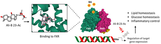 Anti-atherosclerotic actions have been reported with Ali-A, its 24-acetate derivative and Ali-B 23-acetate. For the latter compound, the cholesterol-lowering effect is associated with an increase in FXR-BSEP signaling which leads to a reduction in liver cholesterol, hepatic lipolysis, and bile acids efflux. These cumulated effects concur in reducing damages of atherosclerosis [52]. In addition, the compound exerts anti-inflammatory effects, notably an inhibition of the production of inflammatory cytokines IL-12 (interleukin-12) and IFN-γ (interferon-γ), also contributing to the anti-atherosclerotic effect [64]. The capacity of Ali-B 23-acetate to markedly reduce the atherosclerotic plaque area and lipid accumulation is most likely the resultant of a cumulative effect implicating FXR agonism, anti-inflammatory effects and regulation of cholesterol synthesis and export (Figure 4). Indeed, Ali-B 23-acetate negatively regulates Acyl-CoA cholesterol acyltransferase 2 (ACAT2) in cultured Caco-2 cells and increases expression of ATP-binding cassette transfer proteins G5/G8 (ABCG5/G8) [65]. Multiple receptors and pathways contribute to the capacity of Ali-B 23-acetate to reduce accumulation of triglycerides and cholesterol, including the estrogen receptor α (ERα) to which the compound may bind directly, according to a molecular docking analysis [66]. However, other receptors have been proposed also. For example, the related compounds 16-hydroxy-Ali B 23-acetate and Ali-M 23-acetate have been predicted to bind, with a high affinity, to the liver X receptor β (LXRβ) on the basis of molecular docking and molecular dynamic simulations and to exert an agonist effect [67].