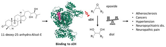 Binding of 11-deoxy-25-anhydro alisol-E to soluble epoxide hydrolase (sEH), the enzyme which converts epoxide molecules into diol molecules, as represented. The modulation of the epoxide/diol ratio is a mechanism by which the compound exerts activities against multiple pathologies, as indicated.