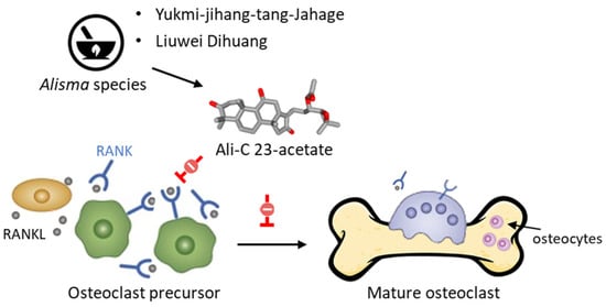 The acetate derivatives of Ali-A and Ali-B have been shown to protect against a decrease in bone mass. As a matter of fact, AR and different TCM preparations containing Alisma species (A. orientale, A. plantago-aquatica, A. canaliculatum) are used to regulate bone resorption, such as Yukmi-jihang-tang-Jahage [101] and Liuwei Dihuang [102]. Both Ali-A 24-acetate and Ali-C 23-acetate display anti-osteoporotic effects [103]. The latter compound is a potent inhibitor of osteoclastogenesis, acting via a blockade of RANKL-induced osteoclast differentiation and function (Figure 6) [104].