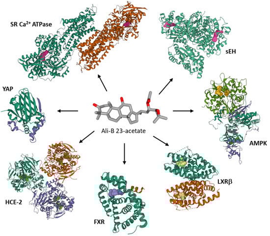 Proposed protein targets for Ali-B 23-acetate. Molecular modeling studies have evaluated binding of the compound to soluble epoxide hydrolase (sEH) [81,82], 5’-adenosine monophosphate-activated protein kinase (AMPK) [70], liver X receptor β (LXRβ) [67], farnesoid X receptor (FXR) [51], human liver carboxylesterase 1 (HCE-2) [126], Yes-associated protein (YAP) [115], sarcoplasmic/endoplasmic reticulum Ca2+ ATPase (SR Ca2+-ATPase) [125]. The protein models shown correspond to the PDB structures 4HAI for sEH, 7MYJ for AMPK, 6K9H for LXRβ, 6HL1 for FXR, YA4 for HCE-1, 3KYS for YAP, 1VFP for SR Ca2+-ATPase.