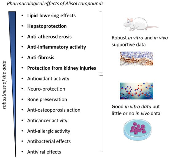 Altogether, the pharmacological effects of Ali-A/-B and their acetate derivatives can be separated in two groups: (1) those with robust in vitro and in vivo data obtained with animal models representative of the studied human pathology; (2) those benefiting essentially, if not exclusively, from in vitro data, and for which additional supportive data are needed (Figure 8). The lipid-lowering, cell protective, and anti-inflammatory effects of Ali-A/-B have been fully characterized (group 1). In contrast, the anti-proliferative and pro-apoptotic activities of the compounds have been well evidenced at the cellular level, but further evidence to support an antitumoral effect in vivo are absolutely needed (group 2). The diverse TCM and phytomedicines containing AR and used to treat cardiovascular and inflammatory diseases can benefit from the pharmacological effects of the alisol compounds. The use of these natural medicines to prevent atherosclerosis and fibrosis can be encouraged.