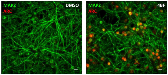 Following 4BF stimulation, neuronal cultures were washed gently with 1× PBS. Cells were gently scraped off and harvested in an Eppendorf tube. Cells were spun down at 10,000× g for 5 min at 4 °C to obtain the cell pellet. Total protein was isolated using an RNA-protein extraction kit (Macherey-Nagel, Düren, North Rhine–Westphalia, Germany), as specified by the manufacturer. A BCA kit (Pierce, Rockford, IL, USA) was used to measure the concentration of proteins. A total of 30 µg of each protein sample was denatured and reduced by boiling at 95 °C for 5 min in 10% (v/v) 2-mercaptoethanol-containing Laemmli sample buffer (Bio-Rad, Hercules, CA, USA). Samples were resolved by SDS-PAGE with a pre-cast Tris-glycine gel (Bio-Rad, Hercules, CA, USA) and transferred onto PVDF membranes using the Trans-Blot Turbo Transfer System (Bio-Rad, Hercules, CA, USA) as indicated by the manufacturer. Membranes were blocked for 1 h at rtp with 5% (w/v) non-fat milk block (Bio-Rad, Hercules, CA, USA) in 1× Tris buffered saline (TBS) (in mM) (140 NaCl, 3 KCl, 25 Tris base) (First Base, Singapore) containing 0.1% (v/v) Tween-20 (TBST), followed by primary antibody incubation for 1 h (anti-Arc, 1:1000, Santa Cruz, Dallas, TX, USA, sc-17839) in 1× TBST at rtp. Membranes were washed three times, each for 5 min in 1× TBST at rtp. Secondary antibody binding was performed using the corresponding HRP-conjugated secondary (1:10,000, Invitrogen, Carlsbad, CA, USA) for 1 h in 1× TBST at rtp. Protein bands were detected with chemiluminescence substrate (Pierce, Rockford, IL, USA) visualised with a Gel Doc XRS imaging system (Bio-RAD, Hercules, CA, USA) or developed on scientific imaging film (Kodak, Rochester, New York, NY, USA).