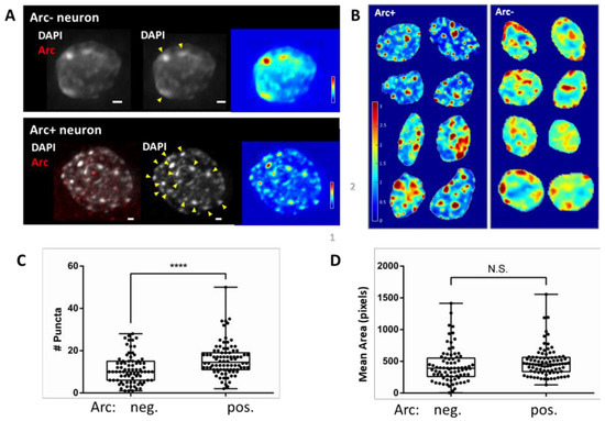 The induction of Arc protein expression by pharmacological network activation (Figure 1) is relatively slow and reaches a maximum level between 4 and 8 h. Arc is only expressed in a subset of neurons. As shown in Figure 2, chromatin organisation is different between neurons that are positive and negative for Arc. Chromatin was visualised by labelling DNA with the fluorescent dye 4′,6-diamidino-2-phenylindole (DAPI). Whereas chromatin in Arc-negative neurons is relatively homogenous, the nuclei of Arc-positive neurons contain many bright puncta, representing chromocenters with densely packed chromatin, in which genes are likely silenced (Figure 2A,B). The puncta are interspersed with domains of highly open chromatin, which is more supportive of efficient gene transcription. The number of puncta increased from 11.1 ± 0.8 puncta in Arc- negative nuclei to 15.9 ± 0.8 puncta in Arc-positive nuclei (Figure 2C). However, the mean area of the puncta was not significantly different between Arc-positive and Arc-negative neurons (Figure 2D).