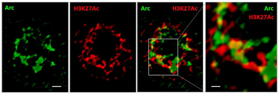 Because Arc was shown to associate with the Tip60 substrate H4K12Ac [29], we have examined interactions of Arc with other histone modifications, by comparing Arc-positive and Arc-negative neurons following pharmacological network activation. The ‘histone code’ [74] is complex and still incompletely understood. We have therefore focused on histone modifications whose function is best studied. In our survey, we have found several histone modifications for which there was a difference in nuclear organisation between Arc positive and negative neurons, including H3K9Ac, H3K4me3, and H3K14Ac (data not shown). Figure 4 illustrates the close association between Arc and H3K27Ac, which marks active enhancers [75,76]. Arc and H3K27Ac form two separate lattice-like structures that are closely inter-connected and, in some locations, appear to overlap (yellow areas in Figure 4).