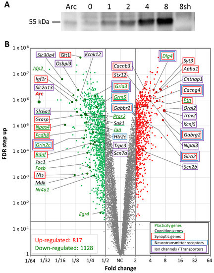 Arc regulates gene transcription. (A) Western Blot showing the time course of Arc protein expression in cultured hippocampal neurons following 4BF treatment (time in hours indicated on top). Lane 7 (8sh) shows that Arc fails to express at 8 hours of 4BF when the cultures are transduced with an AAV0 virus encoding a short-hairpin RNA (shRNA) targeting the coding region of Arc. Lane 1 has purified Arc protein. (B) volcano plot of RNA-Seq results comparing mRNA isolated from neurons after 8 hours of 4BF that were transduced with AAV9 virus encoding either the Arc shRNA or a scrambled version of this shRNA, done in triplicated. Preventing activity-dependent Arc expression resulted in the upregulation of 817 genes (red), and down-regulation of 1128 genes (green). Genest that are below the cut-off (FDR > 0.05) or absolute fold change < 2) are marked in grey. Some of the highly regulated genes in volved in learning and memory are indicated in the plot. Genes are colour coded as stated in the legend. Both axes are log scaled.