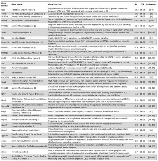 Top ranking genes with neuronal functions. APOE: apolipoprotein E; p-tau: phosphorylated tau; Aβ: Amyloid beta; PI3K/Akt: phosphatidylinositol 3-kinase/protein kinase B; CSCR2: C-X-C motif chemokine receptor 2; HDAC3: histone deacetylase 3; AP-1: activator protein 1; APP: amyloid precursor protein; CSF: cerebrospinal fluid; STIM: stromal interaction molecule; LTP: long term potentiation; GABA: γ-aminobutyric acid; KO: knockout; 5HT: 5-hydroxytryptamine; ER: endoplasmic reticulum; Cav2: neuronal voltage-gated calcium channels. References: 1–3 [82,83,84], 4 [85], 5 [86], 6–8 [87,88,89], 9,10 [90,91], 11–13 [92,93,94], 14 [95], 15 [96], 9,16 [90,97], 17 [98], 18–20 [99,100,101], 21,22 [102,103], 23,24 [104,105], 25–27 [106,107,108], 28 [109], 29,30 [110,111], 31,32 [112,113], 33–36 [114,115,116,117], 37,38 [118,119], 39,40 [120,121], 41 [122], 42,43 [123,124], 44,45 [125,126], 46,47 [127,128], 48 [129], 49–51 [130,131,132], 52,53 [133,134], 54,55 [135,136], 56–58 [137,138,139] 59–61 [140,141,142]. FC indicates fold change, shown as-1/FC when <1.