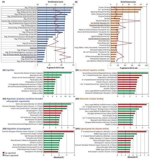 GO analysis of Arc knock-down. (A,B) Gene set enrichment analysis was performed to investigate the biological processes (A) and molecular functions (B) that the altered genes were involved in. The enrichment score is plotted against the category names. The enrichment score is the negative natural logarithm of the enrichment p-value derived from Fisher’s exact test and reflects the degree to which the gen e sets are overrepresented at the top or bottom of the entire ranked list of genes. Bars indicate the enrichment score while the line graph indicates the percentage of genes that are altered under the respective GO term. The top 25 biological processes (A) and molecular functions (B) are shown. Many of the categories are related to synaptic plasticity (underlined blue and orange) [20,21]. (C,D) Bar-charts showing genes involved in the stated category from Biological Processes (Ci–Ciii) and Molecular Functions (Di–Diii) and their respective fold changes. The top 10 regulated genes are shown. Dotted blue line indicates an absolute Fold Change of 2.