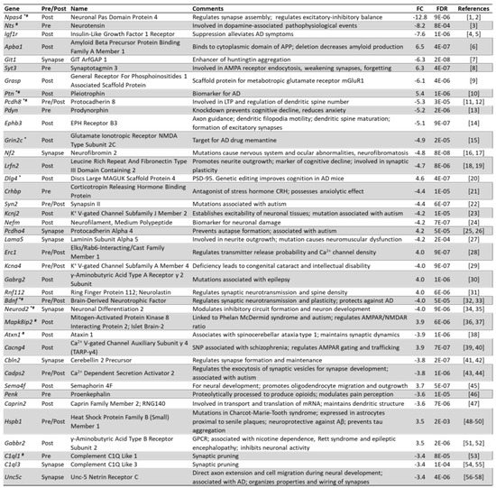 Figure 7 shows the 30 top-ranking genes sorted by absolute fold change (FC) caused by the shRNA- mediated knockdown of Arc expression. Gene names are shown together with a description of their function, their fold change, false discovery rate (FDR), and references to relevant papers. Many of the top-regulated genes are involved in synapse modulation, neurotransmission, neurogenesis and neurological disorders. Interestingly, 9 out of the top 30 genes have been implicated in the pathophysiology of AD (Fgf1, Slc30a4, Npas4, Cxcl1, Jdp2, Nts, Mmp10, Orai2 and Tomm34), while an additional 5 genes are linked to amyloid beta (Aβ) metabolism (Mmp13, Mmp12, Slc2a13, Igf1r and Apba1).