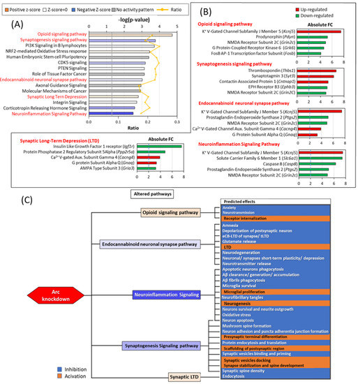 Pathways altered by Arc knockdown. (A) Bar chart showing altered pathways identified by IPA. The orange line graph indicates the ratio of genes that were involved in the specified pathway. The grey line indicates threshold at p-value 0.05. The orange and blue bars indicate predicted activation and inhibition of pathways, respectively (determined by z-score). (B) Top 15 significantly altered pathways are shown. Pathways with predicted activation or inhibition of downstream effects are in red, further elaborated in panel C. The top 5 genes altered in the respective pathways are shown on the right and bottom of the alter ed pathway bar chart. (C) Diagram describing the predicted effects of the altered pathways. Five pathways are highlighted, and the downstream effects as predicted by IPA are listed.