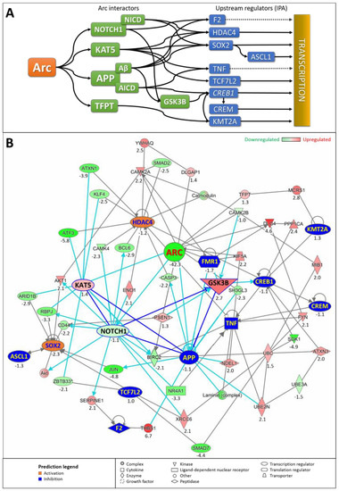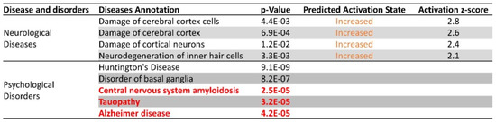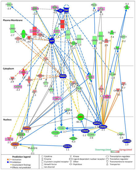 Absence of Arc was predicted to increase damage of the cerebral cortex and its neurons and cells. In addition, Arc knockdown was also associated with psychological disorders, including Huntington’s disease, basal ganglia disorder, central nervous system (CNS) amyloidosis, tauopathy and Alzheimer’s disease. Of note, CNS amyloidosis and tauopathy are predictors of AD. The activation states of the five psychological disorders were not reported, possibly due to inconsistencies in the literature findings with respect to fold changes of the differentially expressed genes. However, the p-values for all five disorders were highly significant, suggesting that the progression of these disorders may be modulated by Arc function.