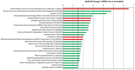 Alzheimer’s susceptibility genes affected by Arc knockdown. The expression levels of 26 AD susceptibility genes were affected when activity-dependent Arc expression was prevented by an shRNA. Green bars indicated that the mRNA level was downregulated, while red bars indicate upregulation. The blue line indicates an absolute fold change of 1.5.
