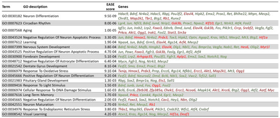 From our GO analysis and a manual curation based on literature citations, we have identified 369 transcriptional regulators and transcription factors whose expression is controlled by Arc. Figure 15 shows the top 40 transcriptional regulators or factors whose mRNA levels were altered when activity-dependent Arc expression was prevented. Some of the transcriptional regulators are involved in neuronal development and differentiation (Fgf1, Tgfb1i1, Fezf2, Jun, Magel2, Neurod2, Atxn1, Gdf15, Prdm1, Mycn, Nr4a2 and Pou2f2), while others are involved in the development of neurological or neurodegenerative diseases (Npas4, Igf1r, Txnip, Lgr4, Cebpd, Pim1, Magel2, Ireb2, Smad7, Sorbs1, Nfil3, Pknox2, Hdac9, Hmox1, Atxn1, Cbfb, Lrp2, Hipk3 and Nr4a2). Many of the transcriptional regulators/factors have been implicated in memory formation and plasticity, such as Thbs1, Jun, Tet3, Fosb, Atxn1 and Cbfb. A GO analysis by DAVID [49] was carried out to identify the biological processes that these transcription factors could be modulating. Figure 16 shows the top 20 biological processes that were regulated by altered transcription factor expression and that have neurological relevance. Corroborating the identified functions of the top 40 transcriptional regulators/factors (Figure 15), differentially expressed transcriptional regulators/factors were observed to be highly enriched in biological processes such as differentiation of neurons, nervous system development, learning, long-term memory and aging (Figure 16). Some of the transcriptional regulators were involved in multiple processes: Npas4, Jun, Bdnf, Nr4a2 and Elavl4 modulate learning, long-term memory, aging, neuron differentiation and nervous system development (Figure 16).