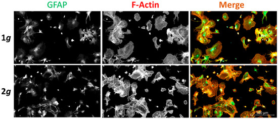 Immunofluorescence staining of primary murine astrocytes cultured at 1g gravity or 2g hypergravity. Primary murine cortical astrocyte cultures, exposed to 1g (top row) and 2g hypergravity (bottom row) for 24 h, were immuno-labeled for the intermediate filament protein glial fibrillary acidic protein (GFAP, green); F-actin was visualized using fluorescently labeled phalloidin (red). The nucleus was stained with DAPI (blue). Bar: 500 µm.