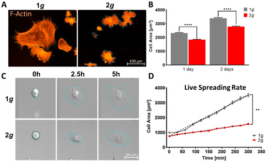 Primary astrocytes exposed to increased gravitational load in the physiological range of 2g demonstrated a decrease in cell area compared to 1g normal Earth’s gravity controls (Figure 2). The cells showed spreading deficits during exposure to 2g in an incubator centrifuge (Figure S1) with consistent area reduction of approximately 21% at 24 h and 18% over the course of 48 h (Figure 2A,B). A similar area-increase from 1d to 2d of 46.3% (±6.8%) at 1g compared to 51.5% (±5.2%) at 2g could be observed in culture. Thus, spreading rates were diminished, but spreading velocities over 24 h were not influenced.