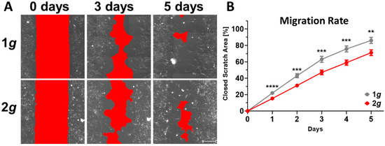 Indeed, we observed markedly reduced migrational velocities in a wound-healing assay with astrocytes exposed to 2g hypergravity in an incubator-centrifuge (Figure 3 and Figure S1). During the course of 5 days, images were acquired every 24 h in a 2D wound-healing assay (“scratch assay”). Astrocyte migration toward the cell-free area was significantly inhibited by approximately 15% after 5 days (Figure 3). The curves diverged more pronounced during the first 3 days, however, cells migrated at their respective steady pace afterwards.