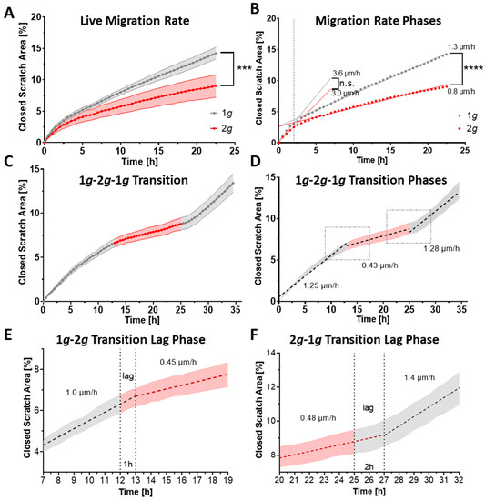 To investigate the influence of acute changes in gravitational loading conditions and the re-adaptation durations, we set up an intermittent wound-healing assay, in which the migrational velocity was measured at normal 1g conditions for 12 h before rapidly switching to 2g for 12 h (with an acceleration ramp-up time of approximately 2 min), followed by a re-adaptation phase of 12 h under normal 1g conditions (Figure 4C–F). This 1g-2g-1g intermittent gravity paradigm revealed a clear dependence and adaptation of migrational speed on the gravitational load. The cells reduced their migrational speed considerably from approximately 1.25 µm/h to 0.43 µm/h during hypergravity exposure (Figure 4C–F). The change in migration velocity was not instantaneous, but repeating adaptive “lag phases” were identified (Figure 4E,F). As indicated by the migration velocities that stayed constant before adapting to the new gravity loading condition, distinct lag periods were determined with approximately 1 h adaptation time from 1g to 2g hypergravity (Figure 4E) and 2 h re-adaption period from 2g hypergravity back to 1g normal gravity (Figure 4F). This change in gravitational force showed a stronger response for the switch from 1g to 2g, i.e., approximately 76% reduction in migration speed (from 1.25 µm/h at 1g to 0.43 µm/h at 2g) compared to the reverse switch from 2g to 1g as the speed exhibited during hypergravity was significantly sustained at 0.43 µm/h before returning to baseline levels of 1.28 µm/h upon re-adaptation to 1g.
