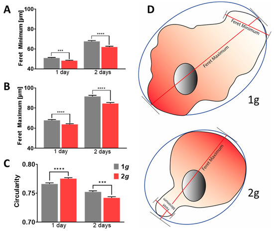Astrocytes under hypergravity in the physiological range of 2g depicted decreased Feret minima as well as maxima (Figure 5A,B). The cells thus decreased in size but did not elongate or polarize. Cells becoming increasingly dissimilar would otherwise depict Feret ratios approaching zero. Rather, astrocytes increased in their circularity during the first day of exposure to hypergravity, which did reverse, however, on the second day (Figure 5C). Otherwise, cells that are hypertrophic, polarized, or migrating have a comparably lower circularity. For migration initiation, lamellipodial protrusions have to be formed. As a consequence, more elongated, seemingly irregular cell shapes were obtained. What distinguishes the circularity values measured in cells from the Feret distances measured in the same sample is that the circularity also considers cells that have a highly serrated boundary because of filopodia and other types of protrusions. In particular, hypertrophic cells exhibit similar Feret minima and maxima and additionally a lower circularity compared to cells with a smoother cell boundary. Thus, within the first 24 h, the morphology of astrocytes exposed to hypergravity changed toward a less polar appearance, resulting from decreased Feret minima and maxima and increased circularity (Figure 5C). During the course of the following 24 h, a switch in circularity was revealed under the influence of 2g hypergravity, as the cells became more irregular. Nonetheless, Feret distance values remained decreased. This might indicate that more small protrusions such as filopodia or membrane ruffles had formed at the cell boundaries.