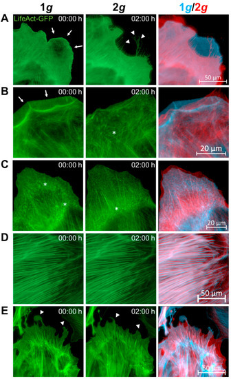 Highly dynamic F-actin rearrangements are altered due to hypergravity. Primary murine transgenic LifeAct-GFP expressing astrocytes were subjected to 2g hypergravity on the Hyperscope live-cell imaging platform on the DLR human centrifuge. (A) Astrocyte lamellipodia (arrows) retracted with filopodia (arrowheads) remaining. (B) Lamellipodial retraction and membrane ruffles (arrows) could be observed. (C) Focal adhesions (asterisks) were still able to form under the influence of hypergravity, but with a change in location towards the cell center. (D) Stress fibers remained intact and largely unchanged. (E) Even though stress fibers remained intact, retraction of larger protrusions (arrowheads) lead to rearrangements also of more stable structures. The cells were exposed to 1g or 2g hypergravity on the same setup on the Hyperscope for 3 h with 2.5 min increments between images. The left and middle images show F-actin structures of an astrocyte at 1g or 2g conditions, respectively. The right image shows an overlay of the 1g (blue) and 2g (red) image in different colors to indicate the structural changes over time as indicated by time stamps in min. Scale bars for every row are indicated in the right panels.