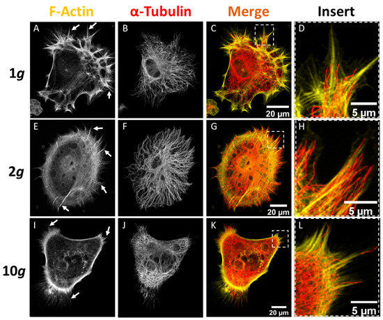 - Corydon, T.J.; Kopp, S.; Wehland, M.; Braun, M.; Schütte, A.; Mayer, T.; Hülsing, T.; Oltmann, H.; Schmitz, B.; Hemmersbach, R.; et al. Alterations of the cytoskeleton in human cells in space proved by life-cell imaging. Sci. Rep. 2016, 6, 1–14. [Google Scholar] [CrossRef]