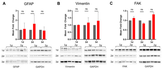 Intermediate filament and focal adhesion protein expression remain stable under the influence of 2g hypergravity. Western blot analysis of glial fibrillary acidic protein (GFAP, 55 kDa), vimentin (54 kDa) and focal adhesion kinase (FAK, 125 kDa). Mean fold changes of the three individual hypergravity samples are shown as compared to the matching 1g controls. Individual blots were obtained for each day of exposure and for each protein of interest matched with the corresponding GAPDH (37 kDa) signal detection on the same membrane. All signals were normalized to the GAPDH signal intensity as a housekeeping gene. (A) GFAP expression remained mostly stable under 2g hypergravity loads (1d p = 0.9437; 2d p = 0.6628; 3d p = 0.9585). (B) The expression levels of vimentin were slightly elevated over the course of 3 days (1d p = 0.9903; 2d p = 0.8397; 3d p = 0.7216). (C) FAK expression was stable under 2g increased gravitational load (1d p = 0.4248; 2d p = 0.3145; 3d p = 0.0741). The lysates were obtained from three individual cultures derived from three mice. The values are shown as SEM, and they were compared via t-test. Significance was indicated as follows: p > 0.05 as ns, p < 0.05 as *, p < 0.01 as **, p < 0.001 as *** and p < 0.0001 as ****.
