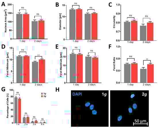 To assess the morphological features of cells and nuclei respectively, several parameters were measured via Zeiss Zen 3 image analysis software (Zeiss, Jena, Germany). The area was measured as a region excluding any holes in µm2. The diameter in µm was calculated by the formula sq(4/pi × area). The circularity was estimated by the formula sq(4 × area). To measure the Feret minima and maxima two straight lines were positioned on opposite sides of the object similar to a sliding caliper at 32 angle positions. The corresponding distance was measured for each angle position with the highest values defined as the Feret maximum and vice versa, with the lowest values for the Feret minimum. The ratio is given by dividing minimum/maximum.