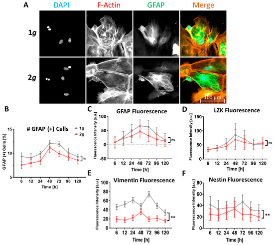 Attenuation of astrocyte reactivity was measured as well on the molecular level by assessing protein expression levels of GFAP and vimentin both by western blot and immunofluorescence signal intensities (Figure 8 and Figure 11). The levels of GFAP, the key marker for astrocyte reactivity, were not significantly changed but rather even slightly decreased following hypergravity. The levels of other marker proteins involved in reactive astrogliosis, i.e., vimentin, nestin, and LZK, similarly showed no significant change in consequence to hypergravity, which was the case for vimentin (Figure 8 and Figure 11), or a decrease in fluorescence intensity, which was apparent for nestin and LZK (Figure 11). Therefore, the decrease of GFAP, nestin, and LZK expression following hypergravity reinforced the conclusion that astrocyte reactivity is attenuated by hypergravity in the physiologically relevant range of 2g.