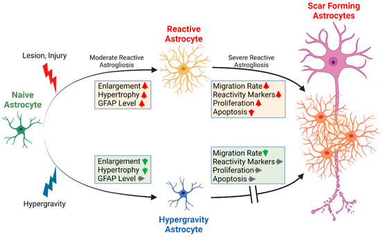 We aimed to analyze the impact of increased gravitational forces, i.e., hypergravity, on the previously mentioned processes and its potential to be used as a novel approach to inhibit the shift from dormant to reactive astrocytes that is coinciding with astrogliosis. Deciphering the underlying mechanisms of these alterations might lead to the identification of target genes or pathways, e.g., for novel pharmacological interventions to eventually treat patients suffering from neurological disorders or injuries.