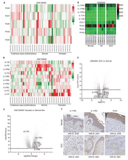 Expression pattern of IL17 and PLK family members in skin cancer and autoimmune diseases. (A,B) Original data of GSE109248 were analyzed using the OmicSoft platform. The heatmap shows the expression patterns of PLK family members among normal skin, cutaneous lupus erythematosus, and psoriasis. (C) The GEO2R tool was applied to differentially determine the expressed genes (p value ≤ 0.01) between psoriasis and normal skin. (D) The heatmap shows expression patterns of IL17 family members and PLK family members among normal skin, actinic keratosis (AK), and squamous cell carcinoma (SCC) of skin. Data were downloaded from GDS2200 database. (E) The volcano plot demonstrates significant genes between SCC and normal skin. Data were downloaded from GSE2503. (F) Immunohistochemical staining of human tissues from The Human Protein Atlas (HPA, https://www.proteinatlas.org/, accessed on 12 July 2022) shows expression patterns of IL17RA, IL17RC, and PLK4 between normal skin and SCC.