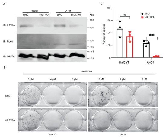 A total of 5 × 105 HaCaT cells or 3 × 105 A431 cells were seeded into a 6-cm dish 24 h before transfection. A total of 50 nM of control siRNA or siIL17RA (cat# sc-40037, Sant Cruz Biotechnology, Dallas, TX, USA) were delivered into the cells with jetPRIME transfection reagent (cat# 101000046, Polyplus, Illkirch, France). A total of 24 h post-transfection, 2000 transfected cells were placed into 6-well plates supplied with 2 mL of DMEM medium (10% FBS). After 24 h, treatment of centrinone with the final concentration of 0, 4, and 8 µM was conducted, and the medium was replaced every 2 days. A total of 14 days post the initiation of the centrinone treatment, cells were washed with pre-chilled phosphate saline buffer, fixed with 4% paraformaldehyde for 30 min at room temperature, and stained with crystal violet (0.1% in 20% methanol) for 30 min at room temperature. Colonies with more than 50 cells were counted.