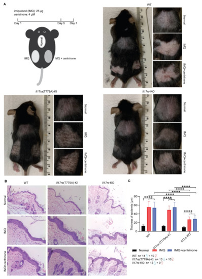 The psoriasis model was established using imiquimod cream (Perrigo) to induce the proliferation of the epidermis in 8-week-old mice [28,29]. In brief, 1.25 mg of 5% imiquimod cream was smeared on the shaved back skin of WT, Il17ra(T779A)-KI, and Il17rc-KO mice for 5 consecutive days. On the right side of the back skin, 8 µM of centrinone (cat# HY-18682, MedChemExpress, Monmouth Junction, NJ, USA) dissolved in 200 µL of acetone (VWR) was topically administrated on the skin after smearing with imiquimod, while on the left side of the back skin, 200 µL of acetone was applied as a solvent control after smearing with imiquimod. After 2 days of consecutive imiquimod use, the mice were euthanized, and skin tissues were harvested and fixed for subsequent histological examination.
