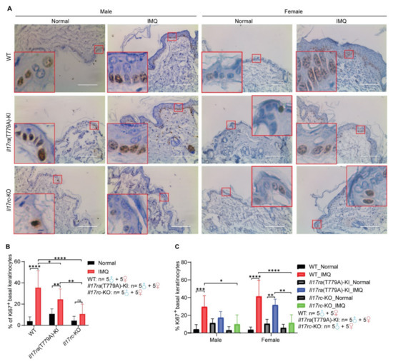 To further evaluate the effect of IL17 signaling on keratinocyte proliferation, 5 samples of male mice and 5 samples of female mice of each subgroup were randomly selected from 69 mice. Ki67 is an established prognostic and predictive indicator of cellular proliferation, so immunohistochemical staining of Ki-67 was carried out to assess the proliferation of keratinocytes in this psoriasis model. Compared with WT and Il17ra(T779A)-KI mice, Il17rc-KO significantly decreased the percentage of Ki67+ basal keratinocytes (Figure 4A,B). Similarly, the mutation of T779A of Il17ra significantly reduced the proportion of Ki67+ basal keratinocytes compared with WT mice (Figure 4A,B). To assess if there is any gender difference regarding the incidence and severity of psoriasis, we further analyzed the differences between Ki67+ basal keratinocytes in male and female mice separately. In female mice, Il17rc-KO significantly decreased imiquimod-induced Ki67+ basal keratinocytes compared with WT and Il17ra(T779A)-KI mice (Figure 4C). However, in male mice, we only observed reduction of Ki67+ basal keratinocytes in Il17rc-KO mice compared with WT mice (Figure 4C).