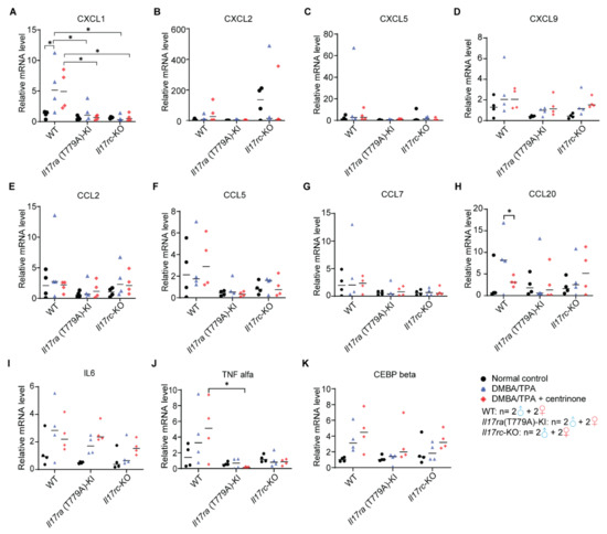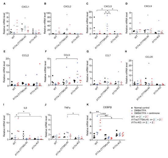 CEBPβ-mediated downstream signaling is inhibited in the psoriasis model. Mouse skin was collected from 4 individuals of each genotype. Total RNA was isolated, and the expression levels of CXCL1 (A), CXCL2 (B), CXCL5 (C), CXCL9 (D), CCL2 (E), CCL5 (F), CCL7 (G), CCL20 (H), IL6 (I), TNFα (J), and CEBPβ (K) were evaluated using real-time PCR. Normalized value was presented as mean ± SD. Statistical significance was assessed by one-way ANOVA with Tukey’s multiple comparison test. *—p < 0.05; **—p < 0.01. The numbers of male and female mice in each group are indicated in the panel.